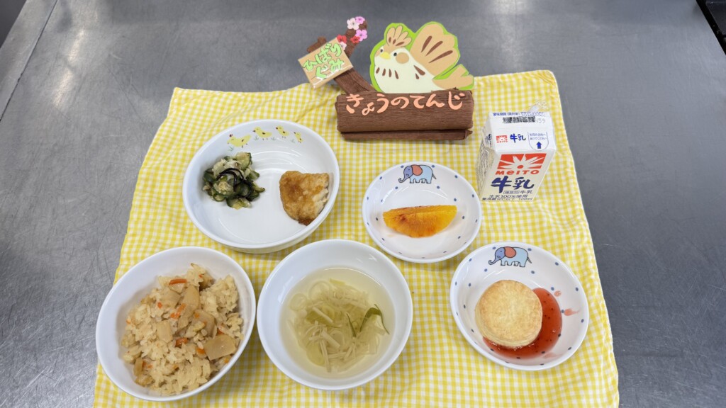 ◎給食 主食:たけのこご飯 汁物:すまし汁(ねぎ・えのき) 主菜:カジキマグロのから揚げ 副菜:野菜の塩昆布和え 果物:ブラッドオレンジ