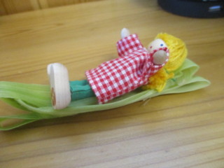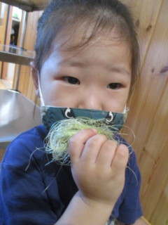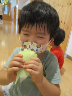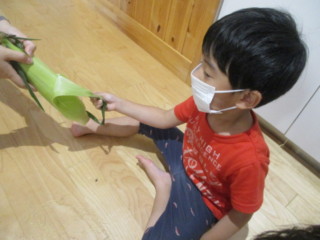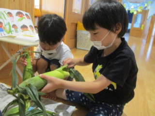 はと組では、とうもろこしの皮で作った船に
