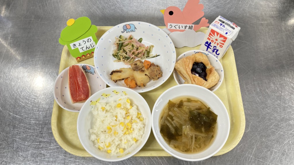 ◎給食 主食:とうもろこしご飯 汁物:みそ汁(葉葱・若布・じゃがいも) ※じゃがいも→大根 に変更になりました